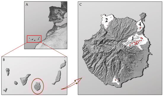 Distribution of California kingsnakes sampled in the island of Gran Canaria. (A). Location of the Canary Islands in the Atlantic Ocean; (B). Location of the island of Gran Canaria in the Canary Archipelago; (C). Representation of the locations where the samples were taken (Nucleus 1, Nucleus 2, Nucleus 3, Nucleus 4). Note: distribution of positive snakes in this study is represented by red dots.