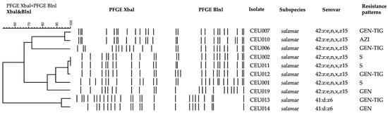 Overall, four different resistance patterns were found (Table 3, Figure 2). GEN alone (36.4%, 4/11) and GEN-TIG (36.4%, 4/11) were the most frequent patterns observed. Isolates with either of these AMR patterns also showed different PFGE profiles (Figure 2). AZI alone and the combination of GEN-AZI-TIG and AMP-CTZ-TIG were only observed once (9.1%, 1/11).