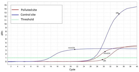 An example of a qPCR result comparing one sample from each site (polluted vs. control) to display how relative mtDNAcn was determined. The amplification plot shows the rate of fluorescence of the SYBR green dye, indicated as ΔRn, vs. the number of PCR cycles: a lower cycle threshold (Ct) represents more DNA copies. The amplification plot shows a lower biomarker level for the polluted site specimen (red curve) due to greater mitochondrial damage.