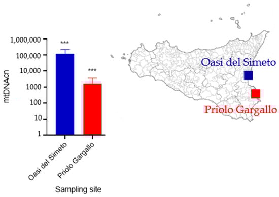 Relative mtDNAcn measured in O. heydeni specimens from Oasi del Simeto and Priolo Gargallo. The Mann-Whitney test resulted in a p-value < 0.001 (***).