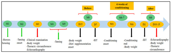 Figure 1. Experiment timeline. The naïve horses were housed at the university and submitted to rational taming. During this period, the experimental procedures were carried out. The incremental exercise test (IET) was performed before and after six weeks of conditioning. The echocardiographic images were obtained before and after the 5.5 month interval, including the conditioning period. M, month; D, day; W, week.