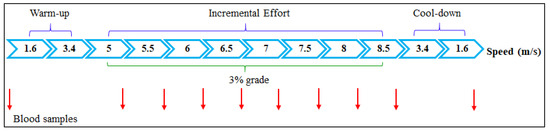Figure 2. Schematic representation of the incremental exercise test (IET). The IET was performed before and after the conditioning period to determine the velocity run by the horse at which the blood lactate concentration reached 4 mmol/L (V4). The horses remained at each speed for 5 min. At the end of each speed of the incremental effort stage, the treadmill was turned off for 1 min for blood sample collection. After obtaining the lactate–velocity curve, it was possible to determine the velocity at which the blood lactate concentration reached 2 mmol/L (V2).
