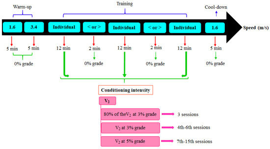 Figure 3. Schematic representation of the conditioning program performed on the treadmill. The intensity of the conditioning program was established based on V2 (velocity at which the plasma lactate concentration reached 2 mmol/L during the incremental exercise test). The conditioning intensity was increased every three sessions. Each session consisted of the following stages: warm-up, training, and cool-down. The training speeds were individualized, and to avoid repetitive strain injury, they were interspersed with 2 min of speed reduction or increase up to the sixth session. From the seventh session onwards, the horses cantered at the training speed, interspersed with 2 min of speed reduction to trot.