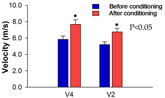 Figure 4. Mean ± standard deviation of V4 and V2 obtained in the incremental exercise test (IET). The graph represents the velocities reached in the test before and after the conditioning program. * Significant increase after conditioning compared to before conditioning (p < 0.05).