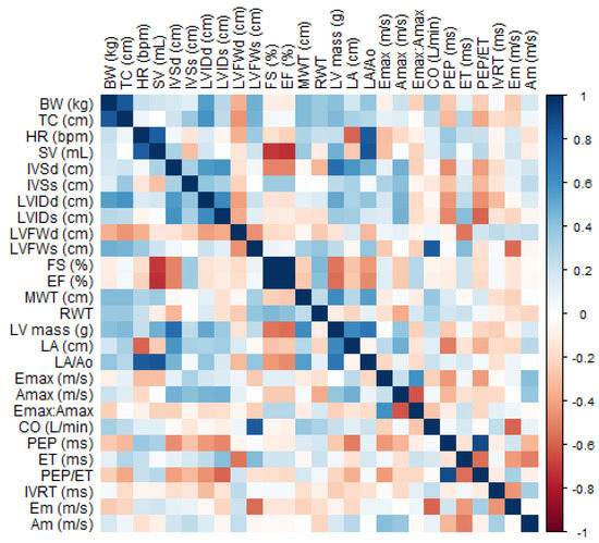 Figure 5. Heat map showing the correlation matrix between echocardiographic and body measurements. The color gradient indicates the correlation between BW, body weight; TC, thoracic circumference; and HR heart rate during echocardiography and other variables obtained and calculated from B-mode, M-mode, mitral flow Doppler (Emax, Amax, Emax:Amax), aortic flow Doppler (PEP, ET, PEP/ET) and tissue Doppler imaging of LVFW (IVRT, Em, Am). Refer to Table 2 and Table 3 for abbreviations.