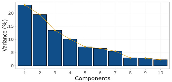 Figure 6. Percentage variation of principal components. The first seven components explained 84% of the variability of the echocardiographic variables. As can be observed, the degree of explainability was low from component eight onwards, justifying the presentation of only ten components.