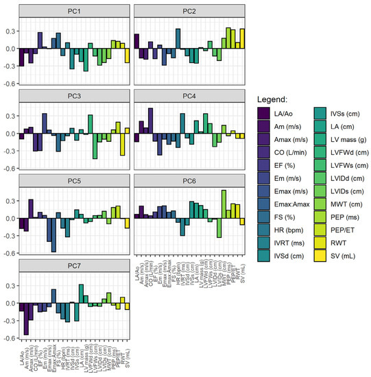The principal component analysis reduced the dimensionality of 24 cardiac variables into seven components with eigenvalues > 1.0, explaining 84% of the total data variability (Figure 6). The contribution of each variable within its component can be seen in Figure 7.