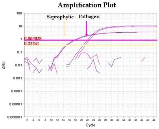 Amplification plot at multiplex qPCR shows simultaneous target amplification for pathogenic and saprophytic Leptospira, observing a higher concentration for the saprophytic species target. Yellow and pink string lines indicate the Ct Threshold belong to saprophytic and pathogen Leptospira strains, respectively.