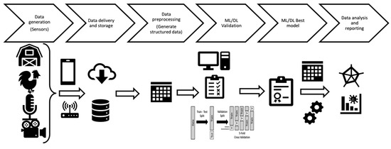 Although not exhaustive, the reported overview of data collection methods and sensors demonstrate the breadth of fields that can be investigated using different technologies, ranging from management efficacy improvement and assessment to animals’ welfare and health monitoring, biosecurity implementation, early-stage disease detection in animals, etc. Nevertheless, the amount and variability of generated data can be dispersive and hamper their interpretability. Therefore, proper data organization, analysis, and reporting are mandatory to produce an effective output and fully benefit from the obtained information (Figure 1).