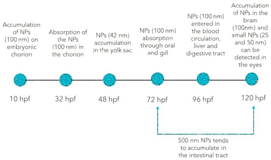 However, it has been shown that the chorionic barrier could prevent plastic MPs accumulation, when they are smaller than 100 nm. Duan et al. [47] recently described the accumulation dynamics of plastic NPs in zebrafish development. Starting with 72 hpf, plastic NPs were absorbed through oral intake and gills, while at 96 hpf, they were easily found in blood circulation, and gradually accumulated in the liver and digestive tract. Further bioaccumulation was observed at 120 hpf in the brain, eyes (<50 nm PS NPs), intestinal tract, and outer epidermis (>50 nm PS NPs) of the zebrafish larvae, as plastic NPs were able to penetrate the blood-brain barrier [47,48]. Similarly, Parenti et al. [49] reported that the PS NPs tended to accumulate in the intestinal tract and later migrate to other tissues in a size-dependent manner, as it was shown in 72 to 120 hpf embryos exposed for 48 h to 500 nm PS NPs. Furthermore, mild OS following short-term exposure to PS NPs of 500 nm has also been reported in zebrafish embryos: significantly increased SOD activity, decreased COX activity, but no relevant CAT and GPx activity changes [49]. Despite these, PS NPs have been shown to induce apoptosis in brain tissues of zebrafish embryos, developmental malformations, and excessive ROS activity [46].