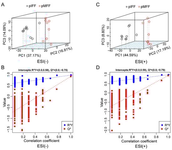PCA and permutation test plots for the pMFF and pIFF. PCA plot (A) and permutation test plot (B) for the pMFF and pIFF in the negative ion model. PCA plot (C) and permutation test plot (D) for pMFF and pIFF in the positive ion model.