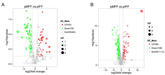 Volcano plot of differentially expressed metabolites between pMFF and pIFF groups in the negative ion model (A) or positive ion model (B).