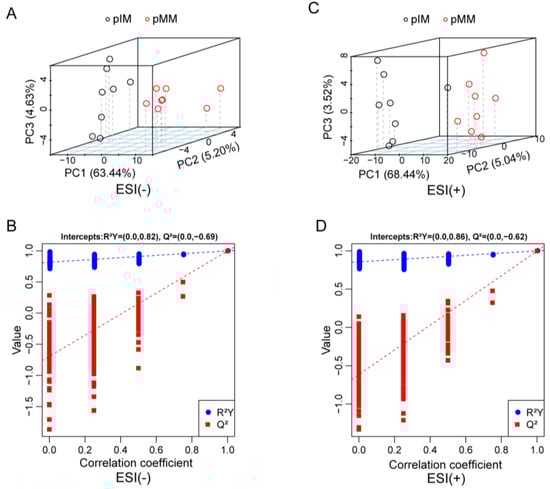 The PCA indicated significant differences in the metabolic profile between the pMM and pIM samples regarding their negative (Figure 3A) and positive (Figure 3C) ion models. A permutation test showed that R2Y = 0.82, |Q2| = 0.69 in the negative ion model (Figure 3B) and R2Y = 0.86, |Q2|= 0.62 in the positive ion model (Figure 3D), which suggests that the models were reliable for subsequent analysis.