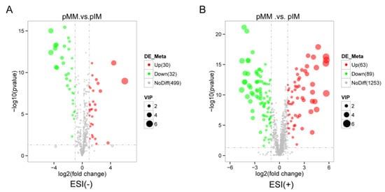 Volcano plot of differentially expressed metabolites (DEMs) between pMM and pIM groups in the negative ion model (A) or positive ion model (B).