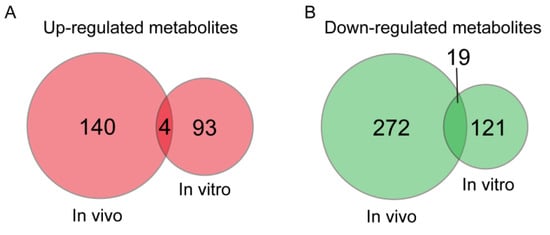 The Venn diagram of metabolites upregulated (A) and downregulated (B) in in vivo follicular fluid and in vitro culture medium during oocyte maturation. The 23 metabolites with a same level change trend are shown in Table 1.