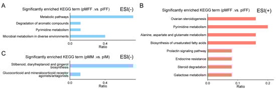 KEGG functional enrichment analysis of DEMs. KEGG functional enrichment analysis of DEMs for pMFF and pIFF in the negative ion model (A) and positive ion model (B). KEGG functional enrichment analysis of DEMs for pMM and pIM in the negative ion model (C).