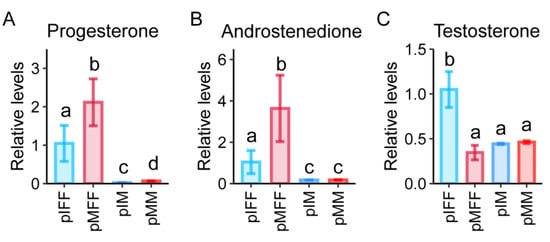 Among the four DEMs that were upregulated during both in vivo and in vitro pig oocyte maturation (Table 1), progesterone attracted our interest because it was also enriched in the KEGG pathway of ovarian steroidogenesis (Figure 6). This suggests that the ovarian steroidogenesis pathway may participate in regulating porcine oocyte maturation. The levels of the three DEMs enriched in the ovarian steroidogenesis pathway, including progesterone, androstenedione, and testosterone, are shown in Figure 7. Progesterone and androstenedione were significantly upregulated while testosterone was significantly downregulated in the FF during in vivo oocyte maturation (Figure 7). Although progesterone was also significantly upregulated in the culture medium during in vitro oocyte maturation, its level was about 31-fold higher in the pMFF than in the pMM (Figure 7A). The level of androstenedione in the pMFF was approximately 20-fold higher than that in the pMM (Figure 7B). This implies that the levels of progesterone and androstenedione in the pig oocyte in vitro culture medium were insufficient compared to those in the FF.