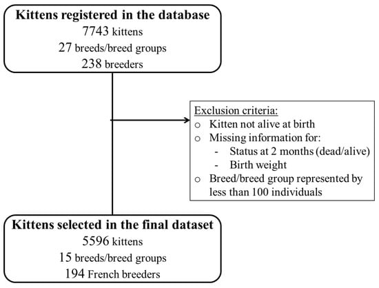 From the total database, several exclusion criteria were applied to select the study population for the current study. All stillborn neonates, kittens born before 2000, and/or with no birth weight provided and/or with unknown status regarding mortality at two months of age were excluded. Finally, only kittens from breeds with at least 100 individuals were included in the final dataset.