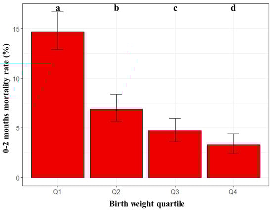 Mortality rates over the first two months of life by birth weight quartiles (n = 5596 kittens). Birth weight categories were constructed based on quartile values calculated at the breed level. The error bars represent statistical uncertainty (95% binomial confidence intervals). Mortality rates were significantly different between the four groups (Tukey post hoc test after the generalized linear mixed-effects model; different letters at the top of the bars indicate significant differences).