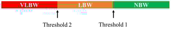 Cut-off values for birth weight regarding the 0–2 months mortality rate were first identified for the species, then, in the second step, refinement was sought by breed. At the species level, two thresholds, 82 and 60 g, were identified by CART analysis. Kittens were thus divided into three groups depending on their mortality risk (Figure 3): normal birth weight (NBW, kittens with birth weight at or above the Threshold 1) with the lowest mortality rate, low birth weight (LBW, between the two thresholds) with intermediate mortality rate and very low birth weight (VLBW, under the Threshold 2) with the highest mortality rate.