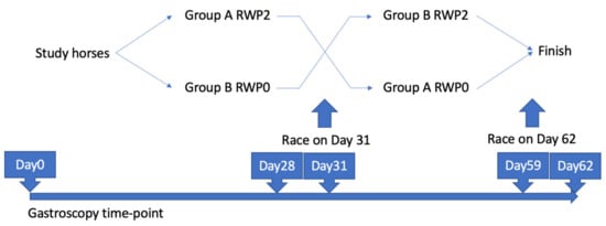 All horses were divided into two groups; group A was subjected to RWP2 and group B was subject to RWP0, crossed over after Day 31 (first mock race day). Gastroscopy examination was performed on Days 0, 28, 31, 59, and 62.