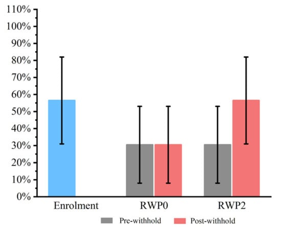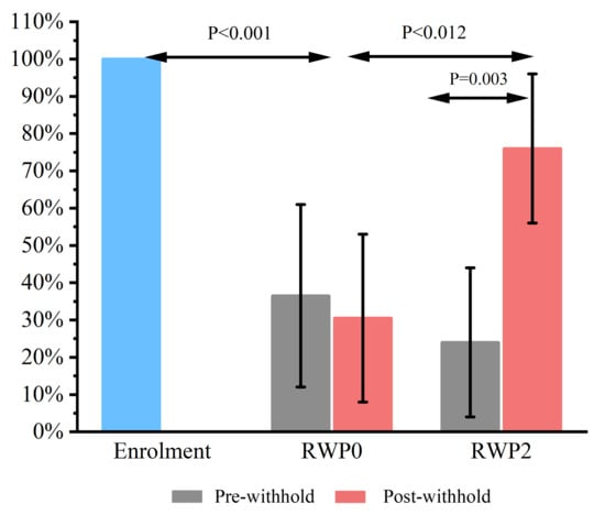 The prevalence post-withhold (3/12; 25%; 95% CI 8–53%) was lower than Day 0 values (12/12; 100%; 95% CI 81–100%) for the RWP0 (p < 0.001). In contrast, there was no difference between post-withhold prevalence (10/12; 83%; 95% CI 56–96%) and Day 0 prevalence (12/12; 100%; 95% CI 81–100%) for the RWP2 (p = 0.478). The data over time for ESGD for the two RWPs are summarized in Figure 2.