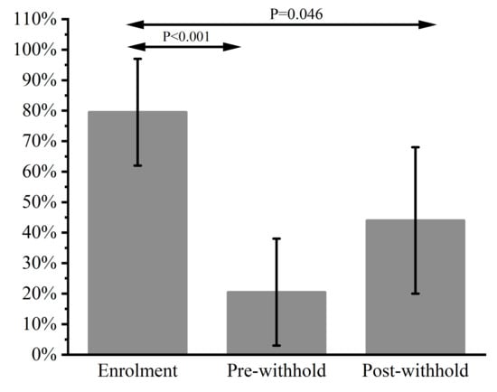 When compared with Day 0 (12/14; 86%; 95% CI 62–97%) treatment with omeprazole resulted in a reduction in the prevalence of ESGD on pre-withhold Day 21 (2/14; 14%; 95% CI 3–38%; p < 0.001). There was no effect of the RWP on the prevalence of ESGD (6/14; 43%; 95% CI 20–68% post-withhold vs. 2/14; 14%; 95% CI 3–38% pre-withhold; p = 0.209). The prevalence of ESGD post-withhold (6/14; 43% 95% CI 20–68%) was lower than on Day 0 (12/14; 86%; 95% CI 62–97%; p = 0.046). The data over time for ESGD for Part 2 of the study is summarized in Figure 4.