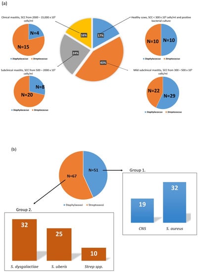Distribution of mastitis cases in analyzed milk samples based on the results of the Californian mastitis test (a) and the number of milk samples with positive bacterial cultures: Group 1. Staphylococcus and Group 2. Streptococcus (b). The Staphylococcus group (Group 1.) was composed of milk samples positive for Staphylococcus aureus and coagulase-negative staphylococci (CNS), and the Streptococcus group (Group 2.) of milk samples classified as positive for Streptococcus spp, Streptococcus uberis and S. dysgalactiae.