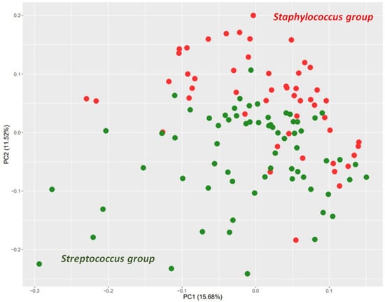 Principal component analysis (PCA) score plot representing the distinction of two experimental groups. The Staphylococcus group (N = 51) was composed of milk samples positive for S. aureus and coagulase-negative staphylococci (CNS), and the Streptococcus group (N = 67) of milk samples classified as positive for Streptococcus spp, Streptococcus uberis and S. dysgalactiae. Experimental groups were differentiated based on abundance ratios of proteins with statistically different abundances, shown in Table 1. PCA was performed in R (v.4.1.2).