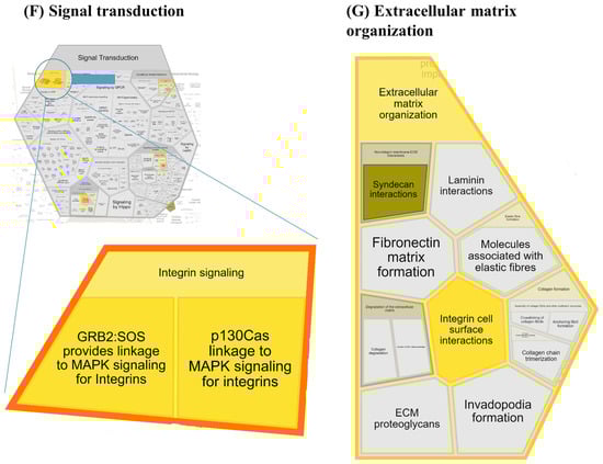 Reacfoam representation of enriched pathways: hemostasis (A), innate (B) and adaptive (C) immune system, metabolism of proteins (D), transport of small molecules (E), signal transduction (F), and extracellular matrix organization (G). Reackfoam was created in REACTOME online tool (v. 83) for differently abundant proteins between the Staphylococcus and Streptococcus groups (Table 1). Gene names MGC137014, MGC151921, LOC525947, and LOC100297192 were not found in Reactome.