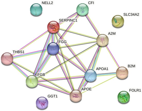 A Reactome analysis identified 15 out of 19 proteins in the Reactome database (MGC137014, MGC151921, LOC525947, and LOC100297192 were not found) mapped to 21 Reactome entities (Supplementary Materials, Figure S2A). In total, 186 pathways were hit with at least one gene name from the query list (Supplementary Materials, Figure S2B), and 25 pathways satisfied the cut-off criteria (p < 0.05 and FDR ˂ 0.05) (Table 3). Hemostasis (coagulation), innate and adaptive immune system, metabolism of proteins, transport of small molecules, signal transduction, and extracellular matrix organization pathways were enriched (Figure 3). STRING recognized 13 proteins (gene names MGC151921, IGL, GLYCAM1, LOC100297192, LOC525947, and MGC137014 were not found). Potential protein–protein interaction networks (Figure 4) and STRING functional enrichment (Figures S3 and S4) are presented.