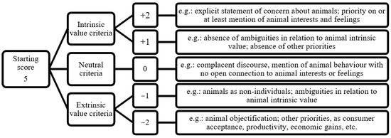Before assessing the study dataset, a short list of criteria was defined and three pilot assessments were run to refine it. The first pilot worksheet included ten papers and the following two included six papers each; none of such papers were in the study’s main database, as they were selected from different sources. For the pilot assessment results, to keep track of the coherence across scores given by the five assessors evaluating independently the same set of papers, Cohen’s kappa coefficient [16] was used and remained in the moderate range after the three rounds of paper assessment. Meetings for the discussion and improvement of criteria were required for the three pilot assessments, after which the five assessors reached a consensus for the list of criteria to be included and their respective weighted scores. It was decided that each paper was to be scored between 1 and 10, according to the established criteria (Figure 1). Each paper was scored considering all criteria, and scores were added for intrinsic value criteria and subtracted for the opposite criteria in a cumulative manner. A score of 10 was given to papers assigning intrinsic value to animals; in other words, those in which the focus was animal welfare considering the perspective of the animals. The score 1 was given to papers on exactly the opposite side of the spectrum, focusing on issues not related to the interests of the animals, such as increases in productivity, a better quality of animal products, and better reproductive success, among others, and the perspective and interests of the animals themselves were only tangentially addressed, if addressed at all. The assessment starting score for each paper was 5, the intermediate point in the scale, and then score points were added or subtracted, depending on the identification of intrinsic, neutral or extrinsic values to animals (Figure 1).