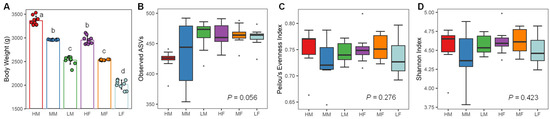 After removing low-quality reads and chimeras using QIIME 2, a total of 986,002 reads were retained for 58 cecal DNA samples, with an average of 17,000 ± 5032 sequences per sample. The sequences were assigned to 1904 ASVs, and 586 ASVs were retained after removing those present in <5% of samples. Comparisons of Observed ASVs (Figure 1B), Pielou’s Evenness (Figure 1C), and Shannon Index (Figure 1D) among different BW groups of male and female chickens revealed no significant differences (p > 0.05).