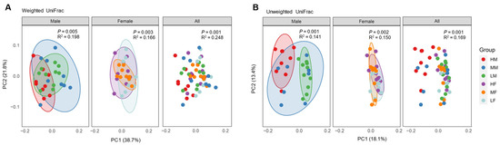 To further compare the differences in the microbiota among different groups, principal coordinates analysis (PCoA) was performed based on weighted UniFrac (Figure 2A) and unweighted UniFrac distances (Figure 2B). In male chickens, PERMANOVA analysis revealed significant separation among different groups in both weighted UniFrac (p = 0.005, R2 = 0.198) and unweighted UniFrac distances (p = 0.001, R2 = 0.141). Significant differences were also observed among different groups in both weighted (p = 0.003, R2 = 0.166) and unweighted UniFrac indices (p = 0.002, R2 = 0.150) for females. Pairwise tests further revealed significance (p < 0.05) in both male and female chickens between high and low-BW groups for both weighted and unweighted UniFrac distances (Table 1). Because of this observation supported by published evidence showing the influence of intestinal microbiota by sex [6,18], males and females were not combined for each BW group for subsequent analyses.