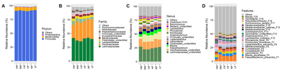 The composition of the cecal microbiota among different groups of day-42 Ross-708 broiler chickens. Average relative abundances (%) of top 3 phyla (A); top 10 families (B); top 15 genera (C); and top 20 ASVs (D) are shown. HM = high male, MM = medium male, LM = low male, HF = high female, MF = medium female, and LF = low female.