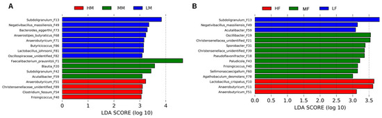 Differential enrichment of the top 100 cecal bacterial ASVs among different groups of male (A) and female chickens (B). LEfSe analysis was performed using p < 0.05 and a LDA score of ≥3.0 as the threshold. HM = high male, MM = medium male, LM = low male, HF = high female, MF = medium female, LF = low female, and LDA = linear discriminant analysis.