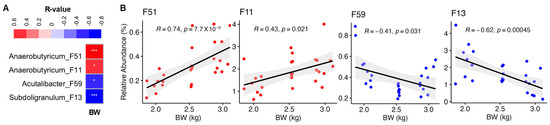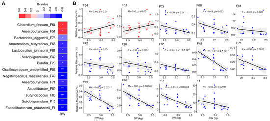 Spearman correlation between BW and relative abundance (%) of bacterial ASVs in male chickens. (A) Correlation coefficient and significance between BW and differentially enriched ASVs identified from LEfSe analysis. Only those features with p < 0.05 and |R| > 0.30 are shown. * p < 0.05, ** p < 0.01, *** p < 0.001. (B) Scatterplots of individual bacterial ASVs showing a significant correlation with BW. Only those with p < 0.001 are displayed for ASVs showing a negative correlation. The solid line in each graph represents the line of best fit, while gray shading indicates the 95% confidence interval. In a few cases, 1–3 outliers were omitted for the sake of better visualization.