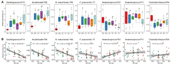 Among them, Subdoligranulum F13 and Acutalibacter F59 largely showed a BW-dependent increase in relative abundance in both males and females (Figure 7A) with a negative correlation with BW, regardless of sex (R > 0.6, p < 0.0001) (Figure 7B). A similar trend also occurred with N. massiliensis F49, which was enriched in low-BW birds showing a strong negative correlation with BW in both sexes (R = 0.52, p < 0.0001) (Figure 7). It is noted that F. praunsnitzii F1, closely-related to Subdoligranulum [19], was also decreased in high-BW males and tended to decrease in females as well, showing a significant negative correlation with BW if both sexes were combined (R = 0.31, p = 0.02) (Figure 7). In contrast, Anaerobutyricum F51 was enriched in high-BW chickens in both sexes with a strong positive correlation with BW (R = 0.5, p = 0.0001) (Figure 7).