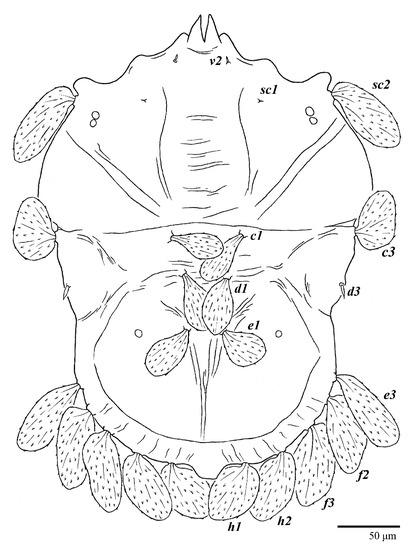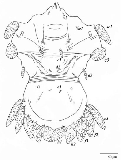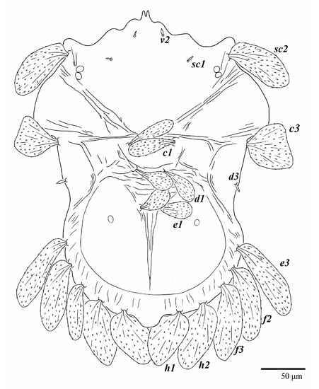 Dorsum (Figure 33). Prodorsal region with broad band of a colliculated integument anteromedially between setae sc1; region between setae sc2–c3 with oblique and transverse folds and plicae; pygidial region posterior to setae e1 with a small region of colliculated integuments; dorsal setae similar in general form to those of the female, except setae c1, d1, and e1 are short to minute. Setal measurements: v2 3, sc1 3, sc2 28, c1 4, c3 23, d1 2, d3 3, e1 3, e3 missing, f2 30, f3 25, h1 21, h2 21.