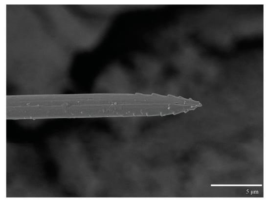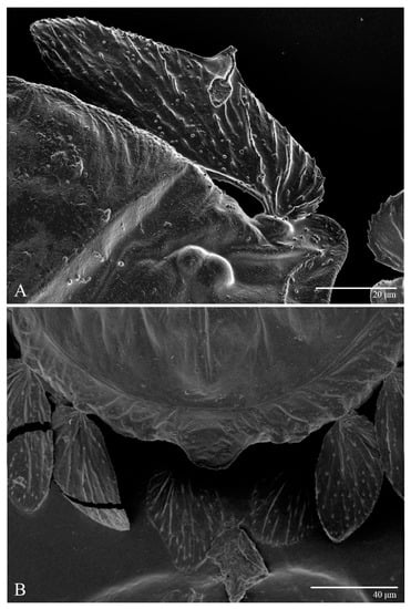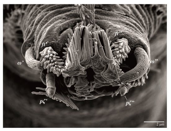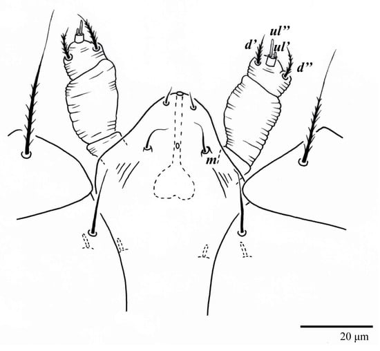 Gnathosoma (Figure 7, Figure 8 and Figure 9). Palps four segmented, setal formula: 0, 0, 2, 2; tibia with two setae, d′ 7 (6–8), d″ 6 (5–6), tarsus with one eupathidium 5 (3–5) and one solenidion 1 (1–2). Ventral setae m 8 (6–8); distance between setae m–m 14 (13–16). Tips of cheliceral stylets with a few bluntly rounded lateral projections (Figure 9).