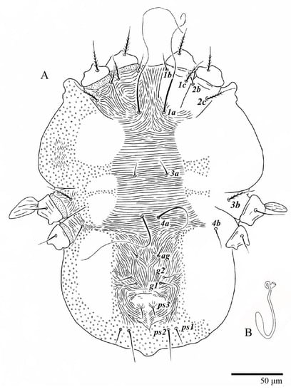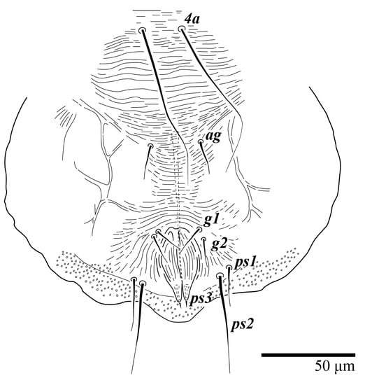 Venter (Figure 31). Cuticle covered with fine and mostly transverse striae; with band of a colliculated cuticle around posterior body margin. Coxal, genital, and anal setae fine. Setal lengths: 1a 75–90, 1b 9–12, 1c 11–15, 2b 10–18, 2c 13–16, 3a 10–15, 3b 16–17, 4a 60–80, 4b 11–12, ag 11–15, g1 8–11, ps1 9–10, ps2 27–33, ps3 15–17. Setae g2 absent.