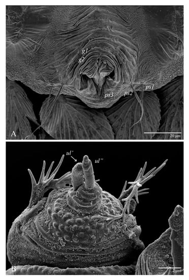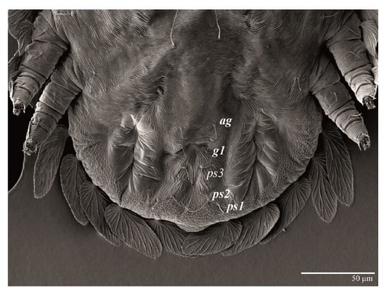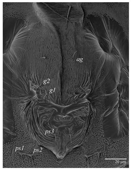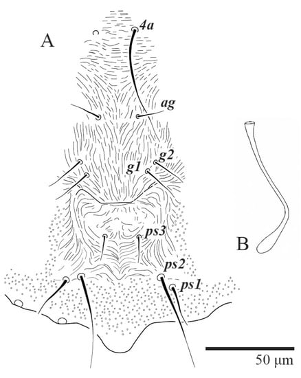 Venter (Figure 13 and Figure 14A). Ventral integument weakly striate along central region and densely colliculated along lateral body margin; ventral setae filiform, with coxal setae 1c, 2c, and 3b barbed; setae ps2 distinctly longer than ps1; setae ps3 thickened and inserted ventrally on the elongate tapered anal valves. Setal measurements: 1a 100–105, 1b 18–21, 1c 27–30, 2b 23–29, 2c 34–35, 3a 17–23, 3b 40–42, 4a 120–130, 4b 23–30, ag 14–15, g1 12–13, g2 14–17, ps1 21–23, ps2 42–55, ps3 13–14.
