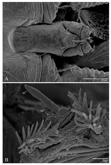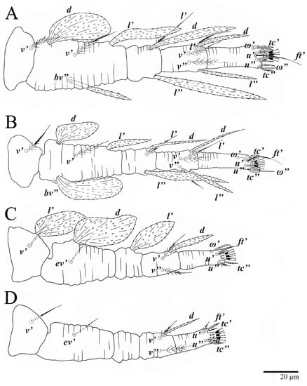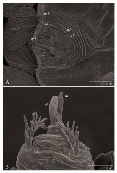 The solenidion ω′ is added on each tarsi I–III in males of U. parameekeri and U. meekeri. Similarly, the male of U. jubatus has this solenidion added to tarsus I and II, but not to tarsus III [2]. This characteristic also occurs in other tenuipalpid genera, such as Tenuipalpus, Prolixus, and Acaricis [26,27,28], with some species of Acaricis also bearing one solenidion ω’ on tarsus IV.