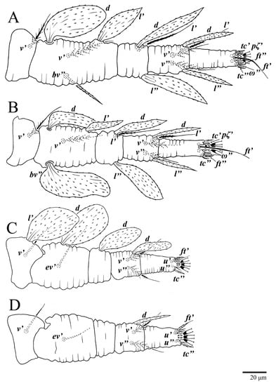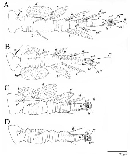 Femora. Setae l′ on femora I and II are added in the deutonymph. The expression of setae l′ on the deutonymph also occurs in U. jubatus and in many species of Tenuipalpus [2,22,23]. Setae d and ev′ are present on femora III in the larva. This pattern is common in the Tenuipalpidae [22], but in U. jubatus, the addition of setae ev′ is delayed until the protonymph. Setae ev′ are added on the femora IV in the protonymph of U. parameekeri and U. meekeri (n.b., femora IV are not nude as described for U. meekeri in [17] and in the keys of [1,2]).