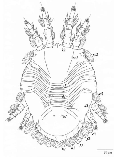 - Gu, X.-Y.; Zhang, Z.-Q. Ontogenetic development of chaetotaxy in Tenuipalpidae: A survey with special reference to sexual dimorphism. Zootaxa 2020, 4900, 154–200. [Google Scholar] [CrossRef] [PubMed]