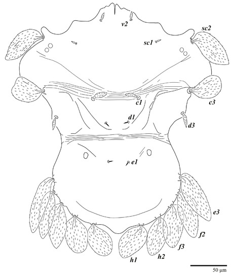 Dorsum (Figure 16). Anterior margin of prodorsum with a short median forked projection forming a short notch; pair of lateral projections anterior and adjacent to setae sc2 present; projection not formed (or rudimentary) between setae h1. Prodorsal region smooth; region between setae sc2–c3 with transverse plicae and folds; region posterior to setae d1–d3 smooth. Dorsal setae similar in general form to that of females, except setae c1, d1 and e1 short to minute. Setal measurements: v2 3–4, sc1 2–3, sc2 60–64, c1 3–5, c3 32–35, d1 2–3, d3 3–4, e1 3–4, e3 45–54, f2 40–42, f3 41–42, h1 35–36, h2 38–45.