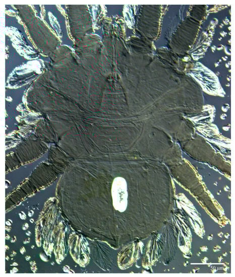 - Castro, E.B.; Ramos, F.A.M.; Feres, R.J.F.; Ochoa, R. A new species of Tenuipalpus Donnadieu (Acari: Tenuipalpidae) from Brazil, with ontogeny of chaetotaxy. Syst. Appl. Acarol. 2015, 20, 339–356. [Google Scholar]