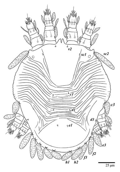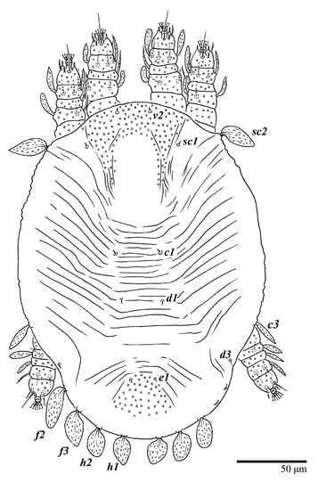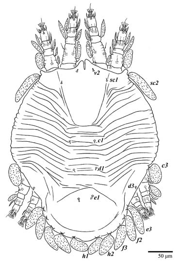 Dorsum (Figure 11 and Figure 12). Anterior margin of prodorsum with a short median forked projection forming a short notch. The dorsum is smooth, with a pair of lateral projections anterior to setae sc2 and a single projection between opisthosomal setae h1. Many dorsal setae similar in general form to those of female, except c1, d1, and e1 short to minute, d3 longer, and setae along posterior margin of opisthosoma (especially e3) narrower and more elongated than those of the female. Setal measurements: v2 5–7, sc1 4–6, sc2 60–67, c1 29–30, c3 40–45, d1 8–10, d3 19–27, e1 5–7, e3 77–80, f2 60–72, f3 60–63, h1 49–50, h2 53–55.