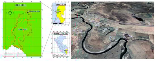 Study area (Andean highlands, Peru): (Left): country: Peru; department: Puno (yellow colored region within the blue map); province: Melgar (green colored region within the yellow map); district: Umachiri (green colored region within the green map), area: Chuquibambilla (triangle within the green map). (Right): Andean highlands study area in Chuquibambilla Experimental Research Centre within the District of Umachiri (~4000 m.a.s.l.; latitude: 14°47′16.46″ S; longitude: 70°43′42.57″ W).