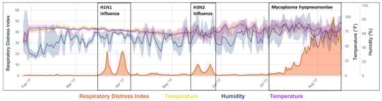 Chart showing Respiratory Disease Index (RDI), temperature, and humidity data from a wean-to-finish barn experiencing clinical episodes of influenza and Mycoplasma [69].